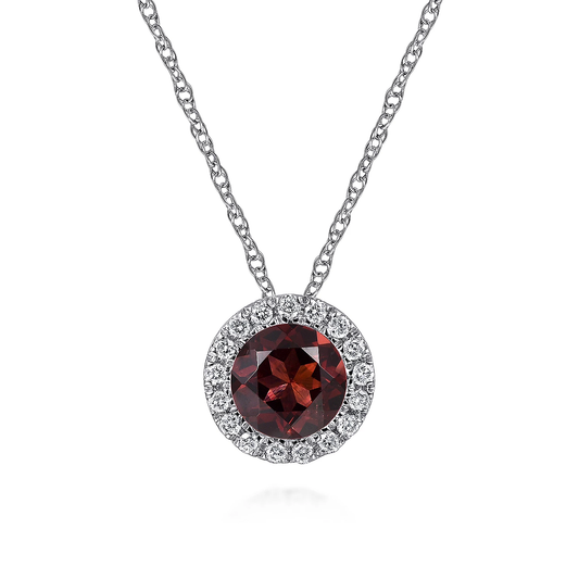 14k White Gold Diamond Halo Garnet Pendant Necklace
