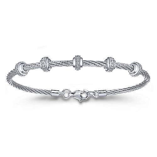 A sterling silver cable bracelet is upgraded with five round diamond stations (.12ctw).
