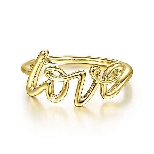 Made in 14 karat yellow gold, this "love" script ring is the perfect way to...