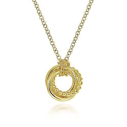 Made in 14 karat yellow gold, this necklace features interlocking plain and beaded circles.