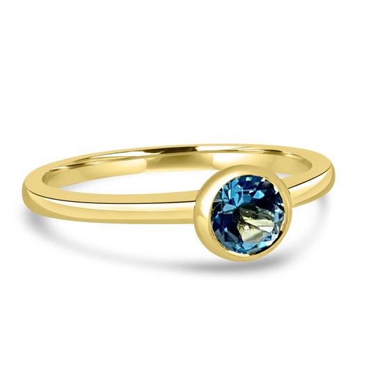 This stunning 14K Yellow Gold ring features a 5mm bezel-set Aquamarine stone, offering a perfect...