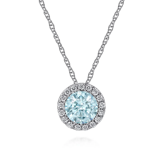 14k White Gold Diamond Halo Aquamarine Pendant Necklace