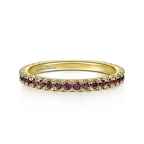 This stackable ring is embellished by Garnet gemstones that compliment the 14k yellow gold band.