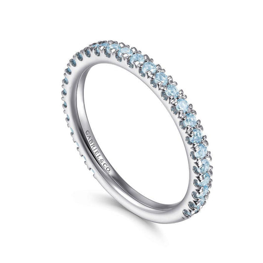 This stackable ring is embellished by sky blue topaz gemstones that compliment the 14k white...