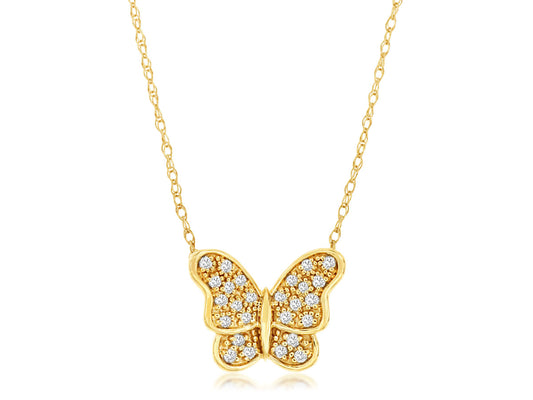 A sparkling statement of metamorphosis, this 14K yellow gold necklace showcases a twinkling .13ctw pave...
