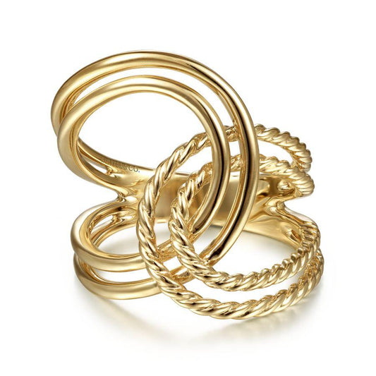 14K Yellow Gold Intertwined Twisted and Polished Rope Ring Width 22.00 mm Thickness 3.50 mm...