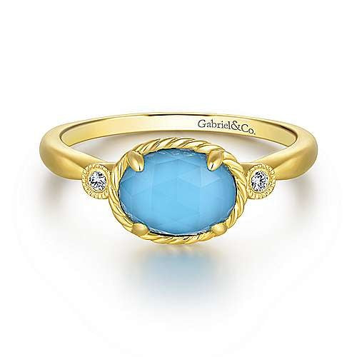 In this elegant 14kt. yellow gold fashion ring, a faceted oval turquoise and rock crystal...