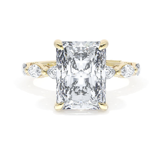 Six marquise cut side stones decorate the ceiling of this 18kt Yellow Gold Radiant cut...