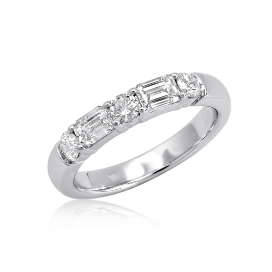 Alternating emerald cut and round diamonds are shared-prong set atop a 3.2 mm wide band....