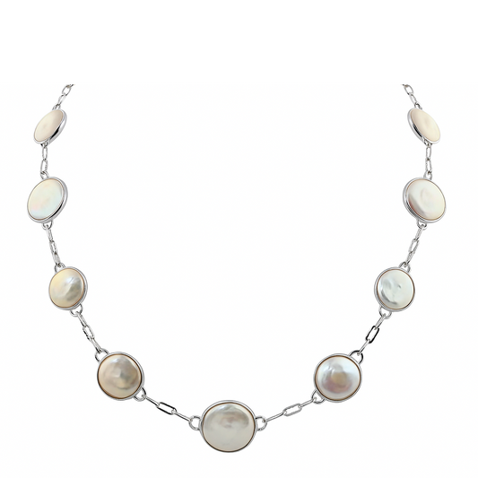Elevate your style with our exquisite 18" necklace featuring lustrous white baroque coin freshwater cultured...