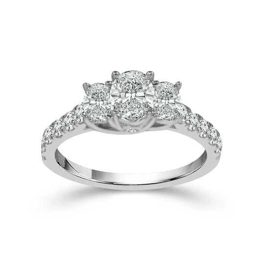 Clusters of three round diamonds sit along either side of this 0.25ct oval cut center...