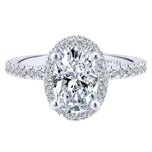 Elevate your oval cut center stone with a magnificent double halo setting. Featuring a scalloped...
