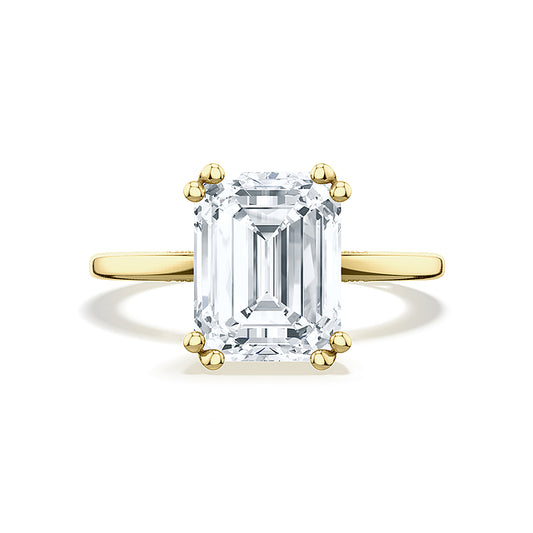 An emerald cut diamond solitaire is brought to life by a crown of diamonds and...