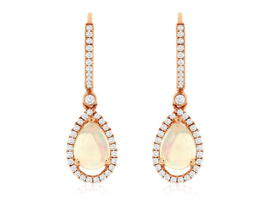 Vibrant pear cut opals garnish these classic October birthstone earrings. Nestled within dangling diamonds (0.34ctw)...