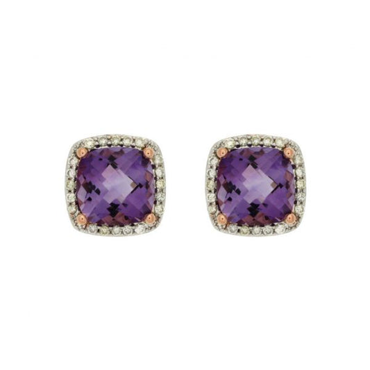 Vibrant cushion cut amethyst garnish these classic February birthstone earrings. Nestled within halos of dazzling...