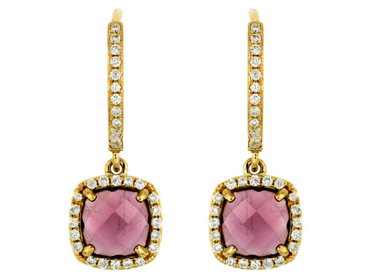 Vibrant cushion cut rhodolites garnish these classic gemstone earrings. Nestled within dangling diamonds (0.25ctw) and...