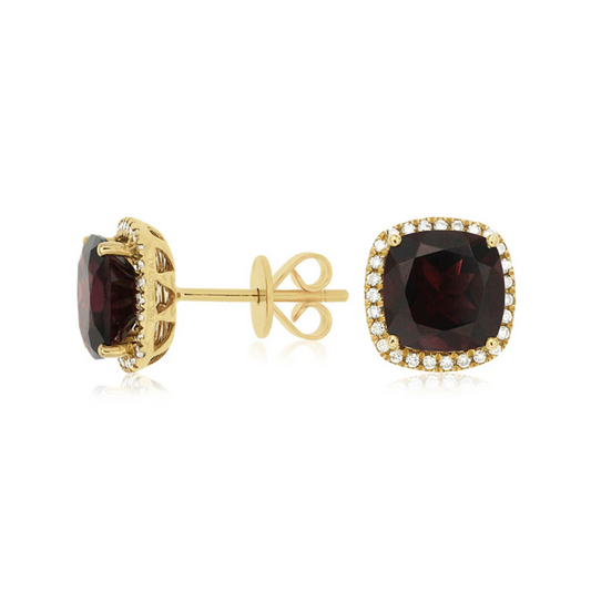 Vibrant cushion cut garnets (5.50ct) is the centerpiece of these beautiful stud earrings. Delicate halos...
