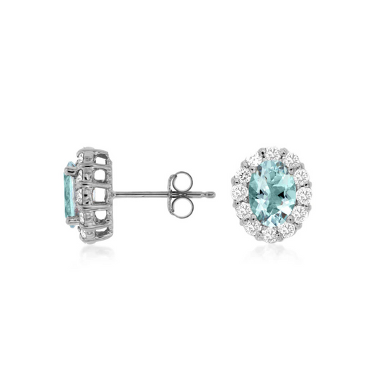 Subtle oval cut light blue aquamarines (1.35ctw) garnish these classic March birthstone earrings. Nestled within...