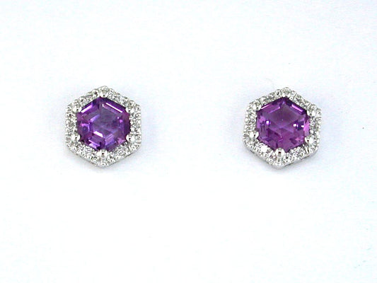 Vibrant purple hexagon shaped amethysts (1.00ctw) are the centerpiece of these beautiful stud earrings. Delicate...