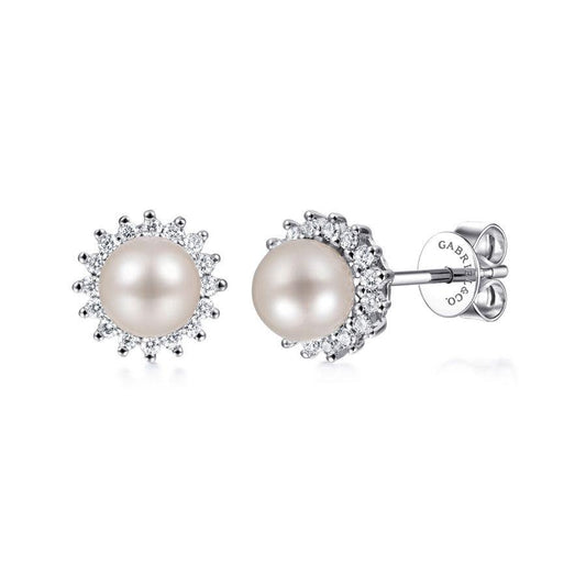 Simple yet stunning cultured pearl stud earrings are enveloped within a scalloped halo of 0.22ct...