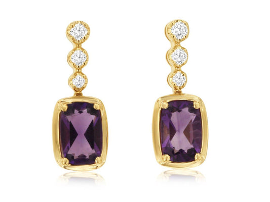 Elevate your elegance with these stunning 14K Yellow Gold Amethyst and Diamond Dangle Earrings. Featuring...