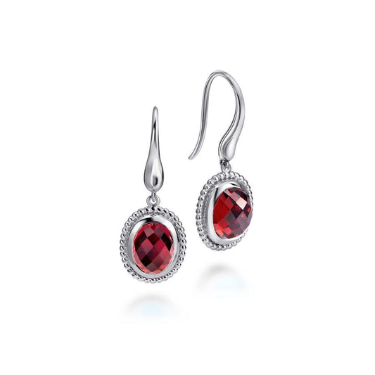 Sterling Silver Beaded Oval Garnet Drop Earrings