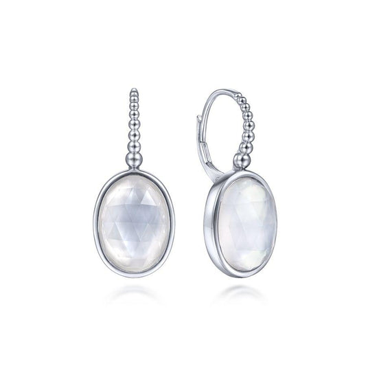 Faceted, oval cut white mother of pearl and rock crystal stones anchor these alluring drop...