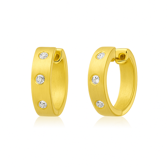 Elevate your everyday style with these modern 14KT yellow gold brushed-finish hoops, each set with...