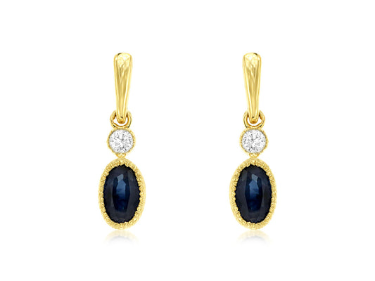 Vibrant round cut sapphires garnish these classic September birthstone earrings. Nestled within polished 14k yellow...