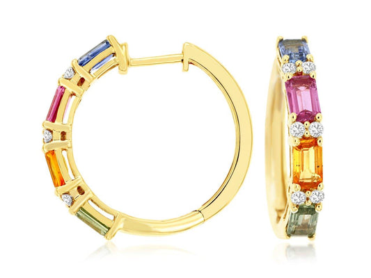 Introducing our stunning 14k Yellow Gold Rainbow Sapphire Hoop Earrings, a vibrant and colorful addition...