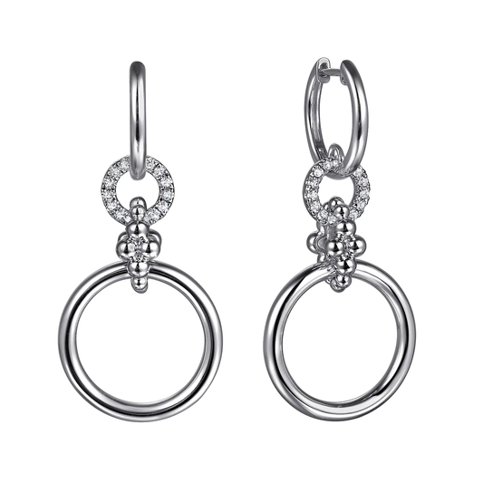 These Sterling Silver drop earrings feature two linked rings, one embellished with shimmering white sapphires,...