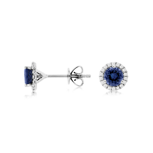 In these timeless stud earrings, each intensely blue round cut tanzanite (0.75ctw) is surrounded and...