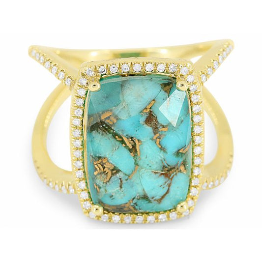 14kt yellow gold .17ctw pave diamond and turquoise open shank ring. Stock size 6.5 Stone...