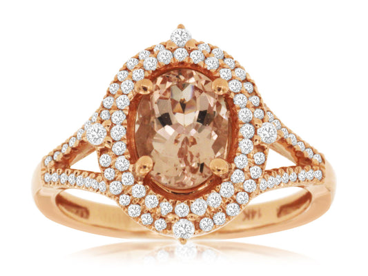 Elevate your look with our Morganite and Diamond Double Halo Ring. Crafted in 14K rose...