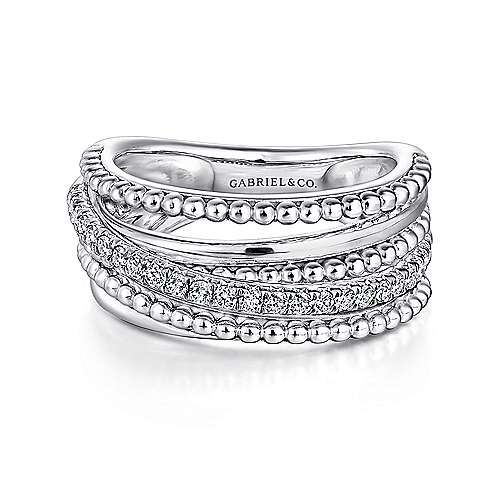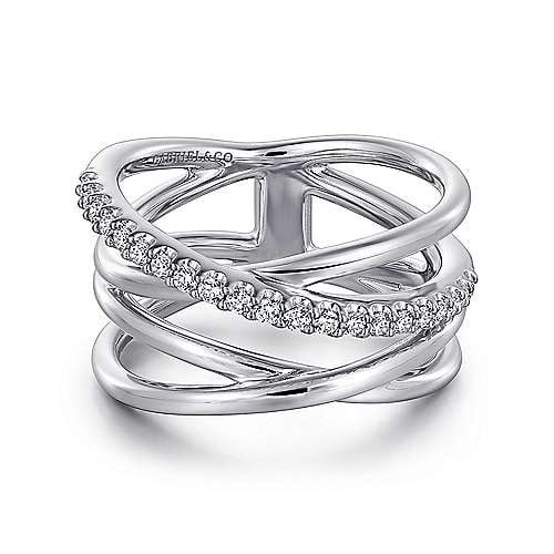 Intersecting diagonal bands of polished 925 sterling silver adorn this chic and modern fashion ring....