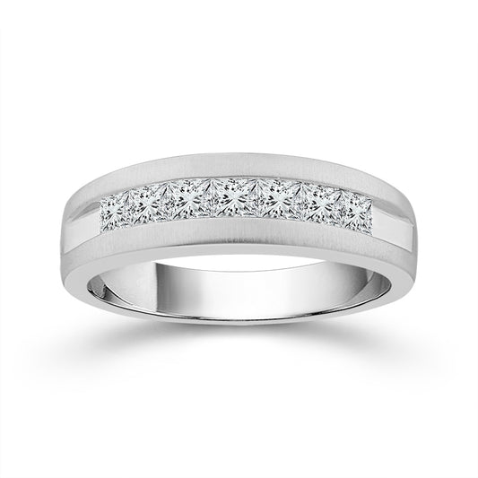 Crafted from 10k white gold this durable band is upgraded with seven round diamonds for...