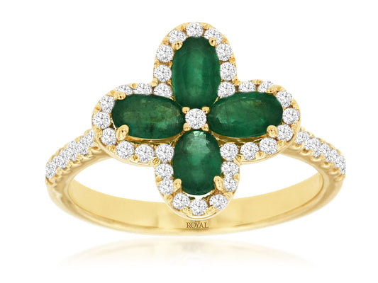 Four oval cut green emeralds (.88ctw) are arranged in a feminine floral design in this...