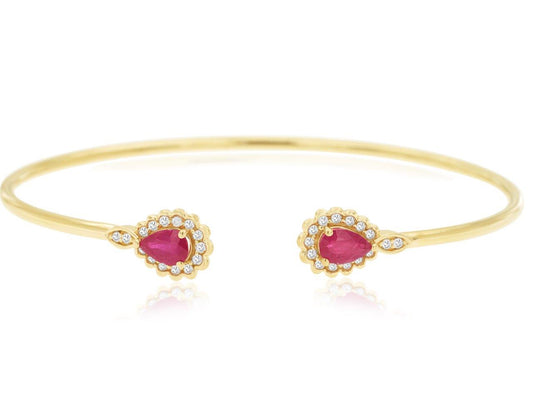 An impressive duo of deep red rubies adorn this 14k yellow gold bangle that will...