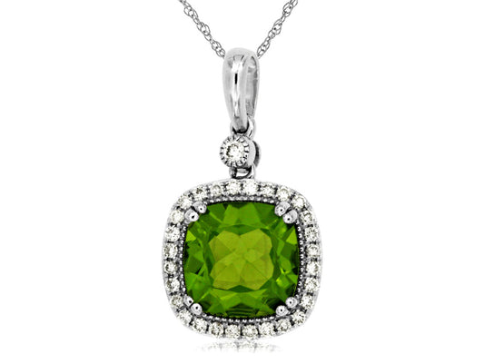 A 2.10ct cushion cut peridot is the striking focal point of this commanding necklace. The...