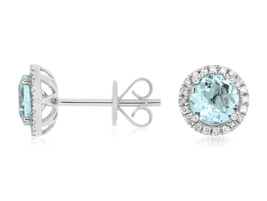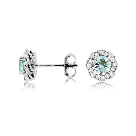 Subtle round cut light blue aquamarines garnish these classic March birthstone earrings. Nestled within halos...