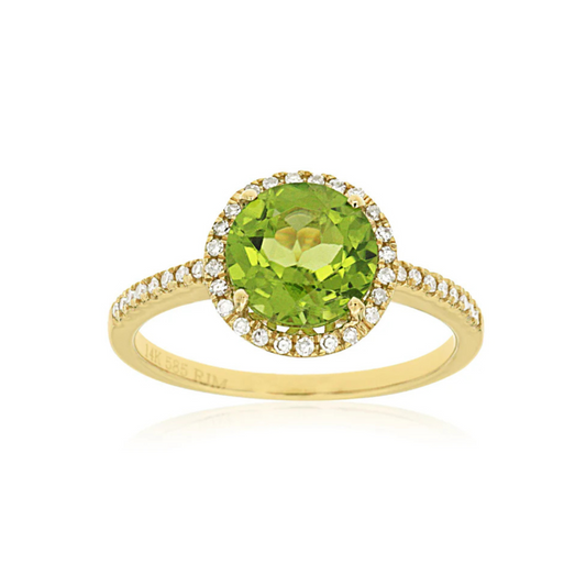 A 2.00ct round cut peridot with a spring green hue is the high-spirited heart of...