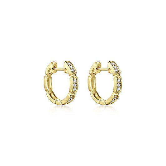 These segmented gold huggie earrings feature groups of shimmering accent diamonds in refined milgrain borders....