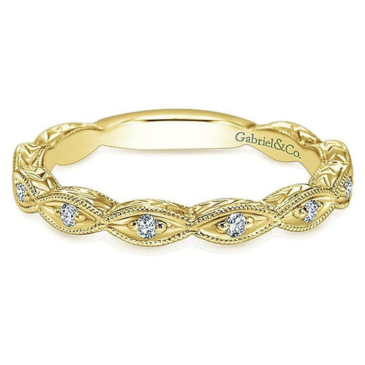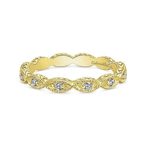 Luminous 14K yellow gold ring designed for stacking featuring brilliant 0.10ct diamonds. Marquise shapes create...