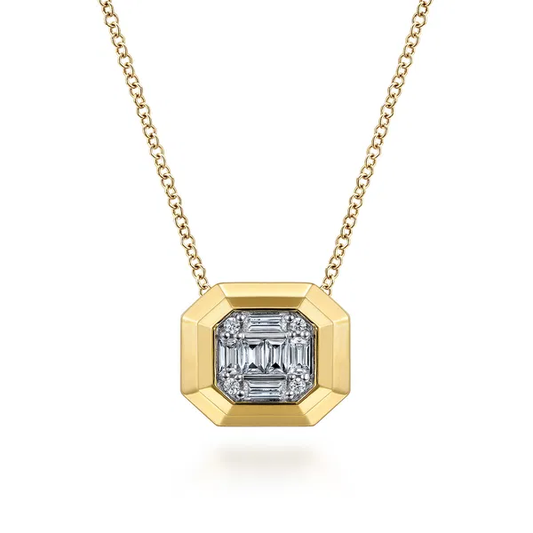 Make a sleek and elegant statement with this 14K yellow gold rectangular diamond pendant necklace....