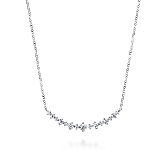 Add a touch of modern sophistication with this 14K white gold graduated diamond curved bar...