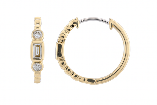 Refined, radiant, and artfully designed—these 14K Yellow Gold Baguette and Round Pavé Small Huggie Earrings...