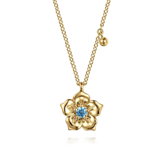 This stunning 14K Yellow Gold Blue Topaz Floral Drop Necklace combines elegance and vibrant color...