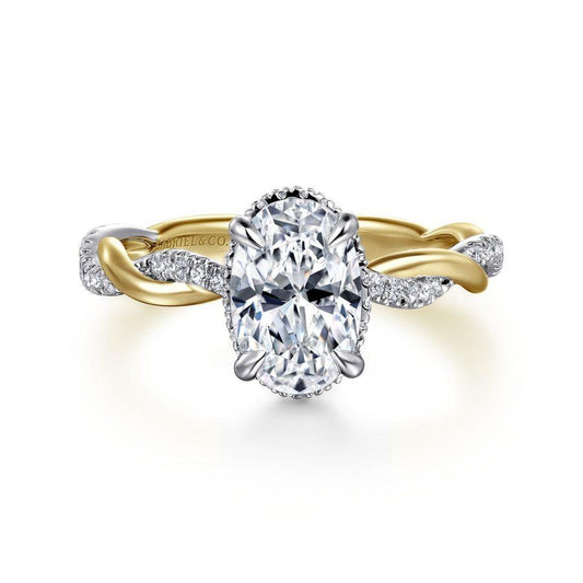This exquisite 14K Two Tone Twisted Pave Oval Diamond Engagement Ring showcases a captivating design...