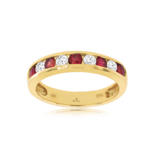 Crafted in luminous 14K yellow gold, this Ruby and Diamond Stackable Ring is a vibrant...