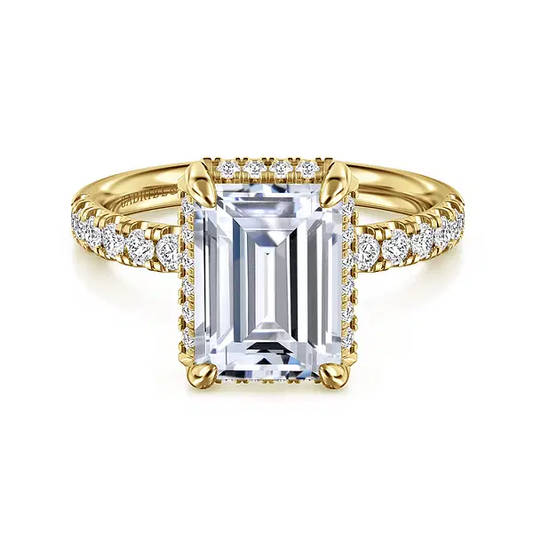 This stunning **14K Yellow Gold Emerald Cut Hidden Halo Diamond Engagement Ring** showcases timeless elegance...